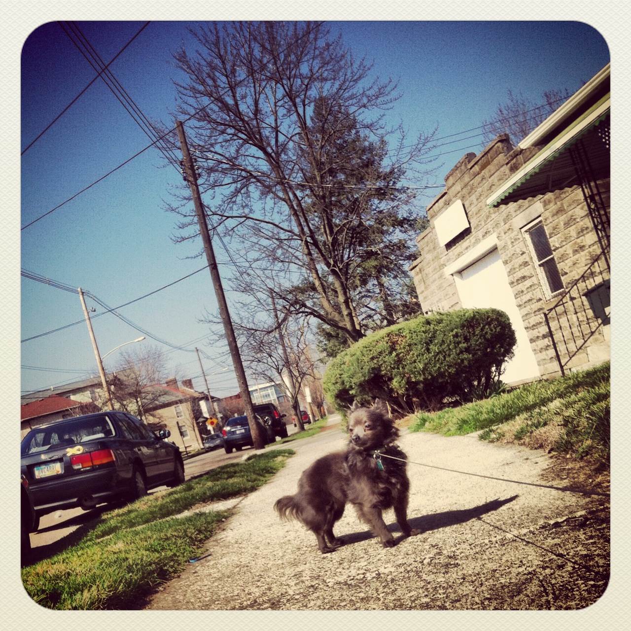 | "I can see the park but my walker thinks it's still too early in the season to go in there. I honestly don't mind getting a little mud on my paws! That just means more pampering when I get home!" |